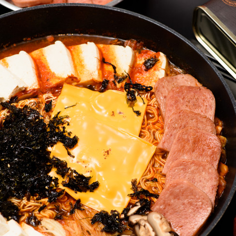 Budae-Jjigae is a spicy kimchi based stew created shortly after the end of the Korean war, giving it its nick name ARMY STEW. It is often served with some instant noodles, spam, sausages, processed ham, kimchi, mushrooms, tofu, some good old CHEESE and everything inbetween. Even though it is called ARMY STEW it is probably not the best meal for any soldier, being filled with process meats and instant noodles it is probably if not THE BEST DISH for any college or university student. Espaically after a LONGGGG night of studying or other activities you just want something quick and comforting, this is exactly what you are looking for. Not to mention it is super easy to make and feeds from 4-8 people and being very cheap it is the ideal late night dinner for any student.